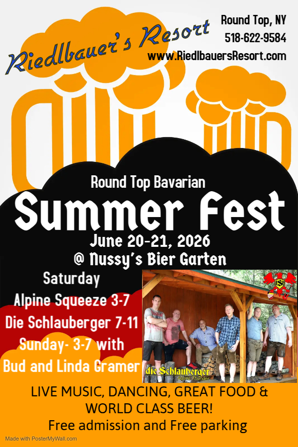 June 19th - 21stRound Top Bavarian Summer FestSaturday (12:00 pm - 11:00 pm)Saturday, June 20thAlpine Squeeze 3pm - 7pmSaturday, June 20thdie Schlauberger 7pm - 11pmSunday (2:00 pm - 7:00 pm)Sunday, June 21stBud & Linda Gramer 3pm - 7pmFood and Drinks, Dance, Family Fun -- Free Parking and Admission2 night minimum