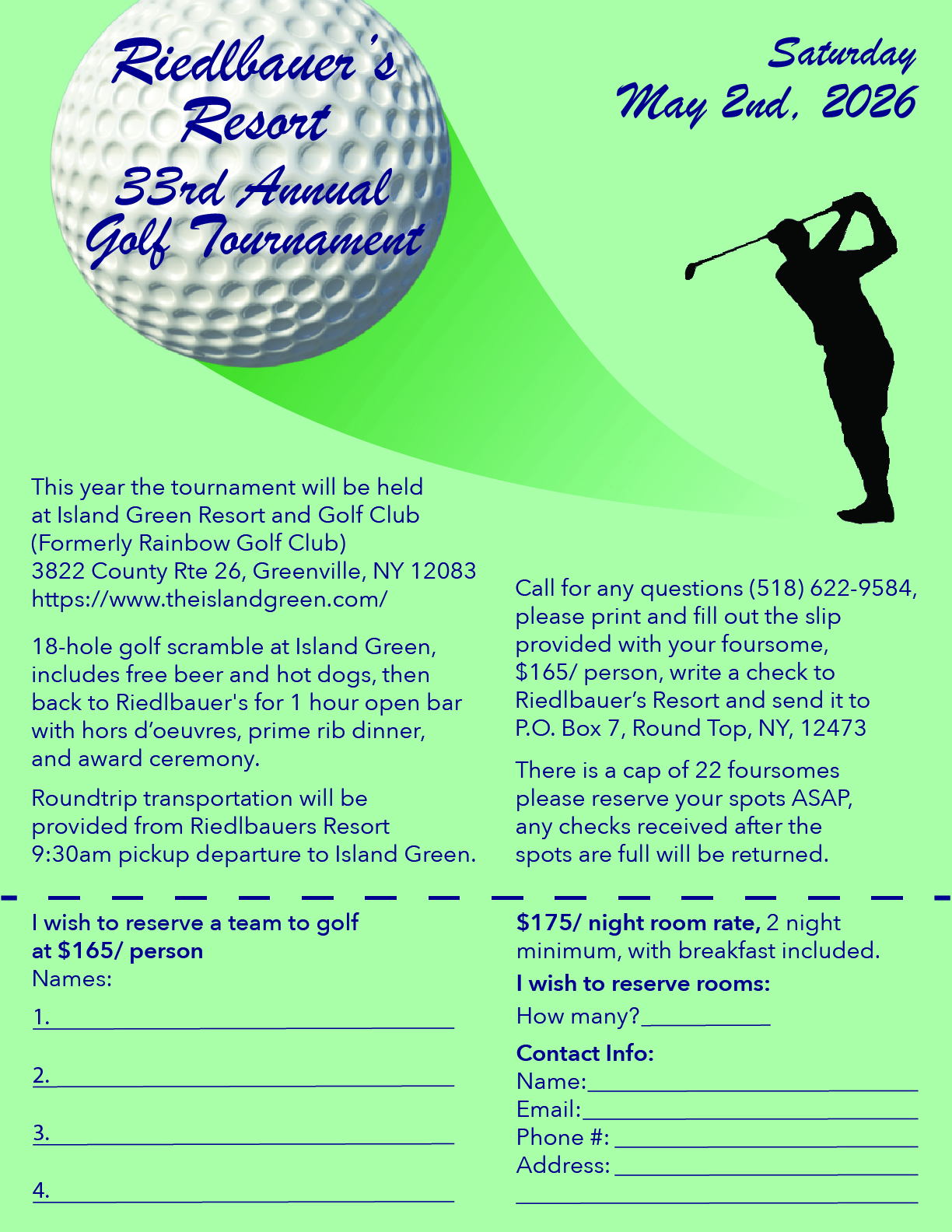 May 1st - 3rdGolf TournamentSaturday:18-hole golf scramble at Island Green, includes free beer and hot dogs, then back to Riedlbauer's for 1 hour open bar with hors d’oeuvres, prime rib dinner, and award ceremony.Call for pricing and reservations