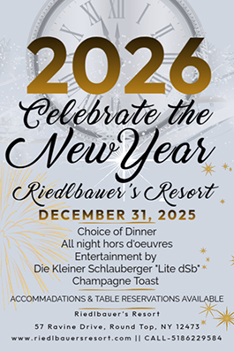 $90 per person includes: Choice of Dinner - All entrees are served with beef noodle soup and a tossed salad with our house dressing. Prime Rib – Served with Au Jus, rosemary potatoes, and green beans. Jägerschnitzel – Pork cutlet served with a rich mushroom gravy, rosemary potatoes and green beans. Filet of Haddock – Oven broiled in olive oil, lemon, and garlic, with rosemary potatoes, and green beans. Dessert - Brownie Alamode or Cheesecake w/ Chocolate Drizzle All night hors d'oeuvres Entertainment by Die Kleiner Schlauberger "Lite dSb" Champagne Toast Please call 518-622-9584 for reservations. 2 night minimum stay required. Room Rates are $175.00 per night with breakfast buffet included with your stay.